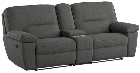 With an updated take on the traditional recliner console loveseat, the Alberta marries old fashioned comfort with current style. Contemporary charcoal gray, piped edging, and a modern approach to pillow tufting all come together to create this transitional set.Read More