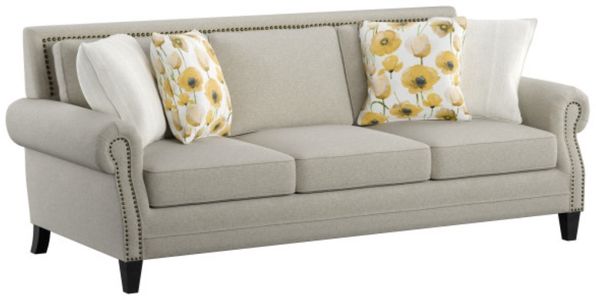 The Celia collection livens up a traditional setting with a pop of color. The contrast of bronze nailhead trim against Saxon beige fabric highlights the elegant shapes of rolled arms and tapered solid wood legs.Read More