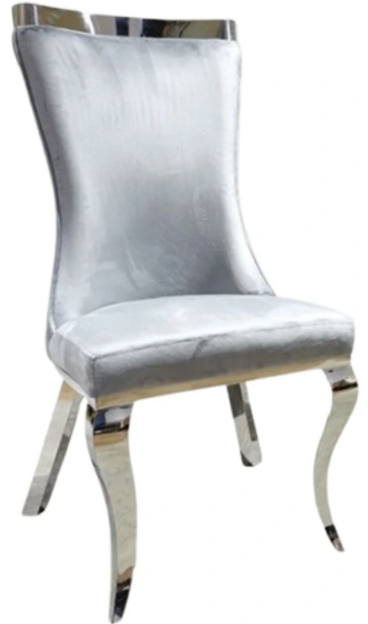 A different take on the common dining piece, this glam dining chair features saber legs with gray velvet upholstery and silver finish. The beautiful upholstered seat is a warm elegant and charm color.Read More