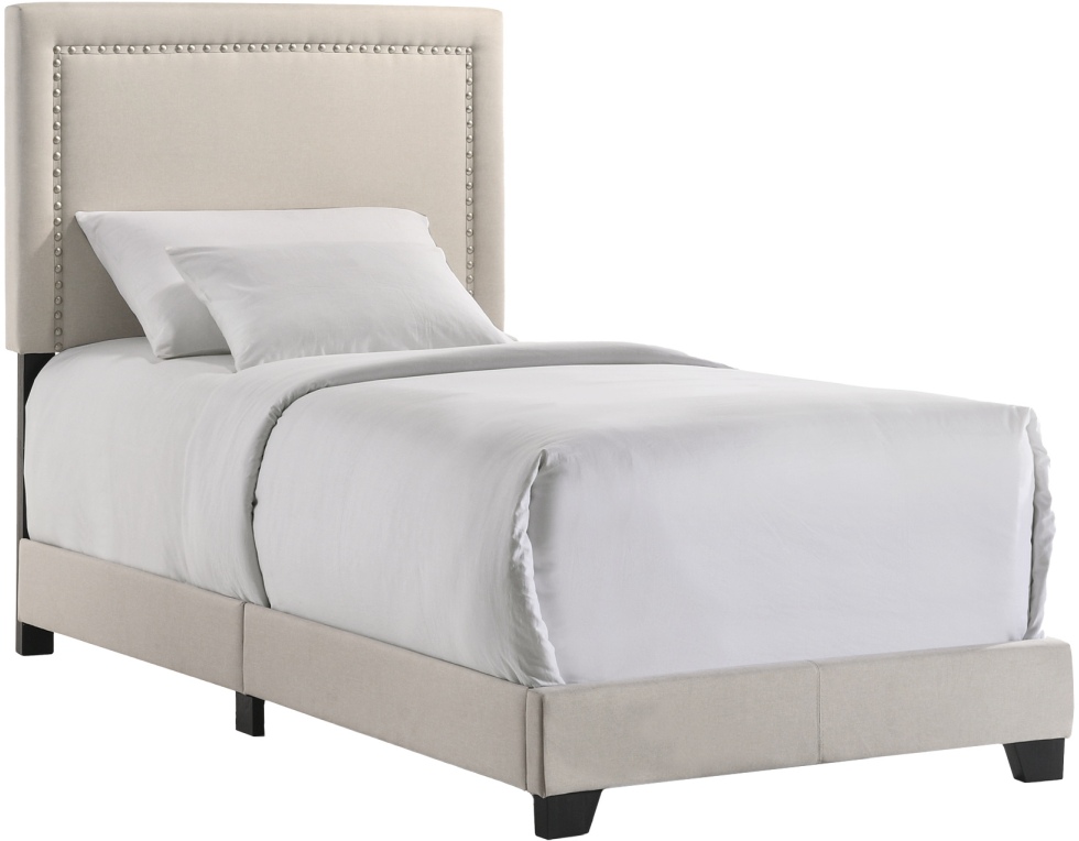 The Zion upholstered bed collection features a fog fabric covering a sleek headboard with matte chrome nail head accents. The poplar and rubberwood construction rounds out this collection, making it not only stylish but durable as well. These beds are offered as king, queen, full, and twin sizes.Read More